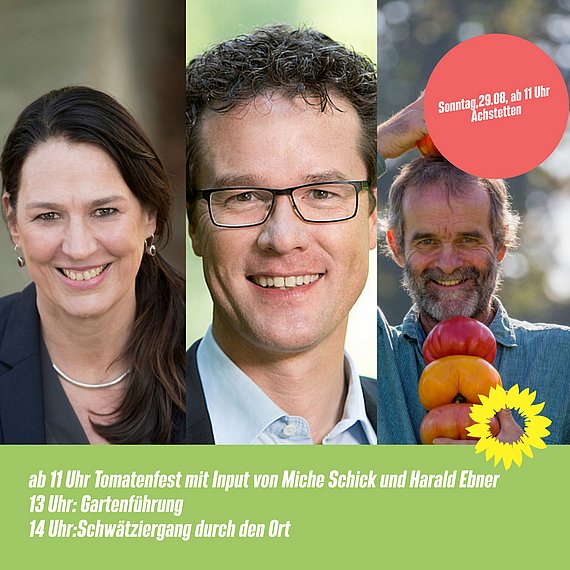 Um 11 Uhr begrüßt Schick mit einem Tomatenvortrag über Sortenvielfalt, Anbau und Pflege. An dieser gartenbaulichen Meisterleistung besonders interessiert zeigen sich die Bundestagskandidatin der Grünen aus Laupheim, Dr. Anja Reinalter, und ihr bereits im Bundestag sitzender Parteikollege Harald Ebner, Sprecher seiner Fraktion Gentechnik- und Bioökonomiepolitik und Waldpolitik. Ebner wird um 11:30 einen kurzen Impulsvortrag halten und anschließend für Fragen und Gespräche zur Verfügung stehen.